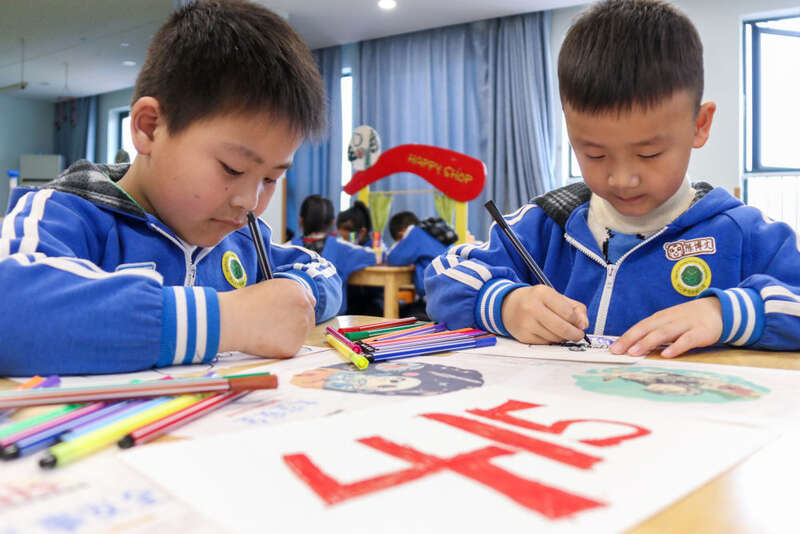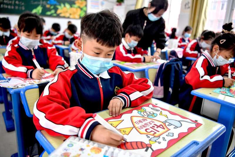 4月14日,在安徽省亳州市风华桐乡路小学,学生参加“全民国家安全教育日”主题绘画活动。
