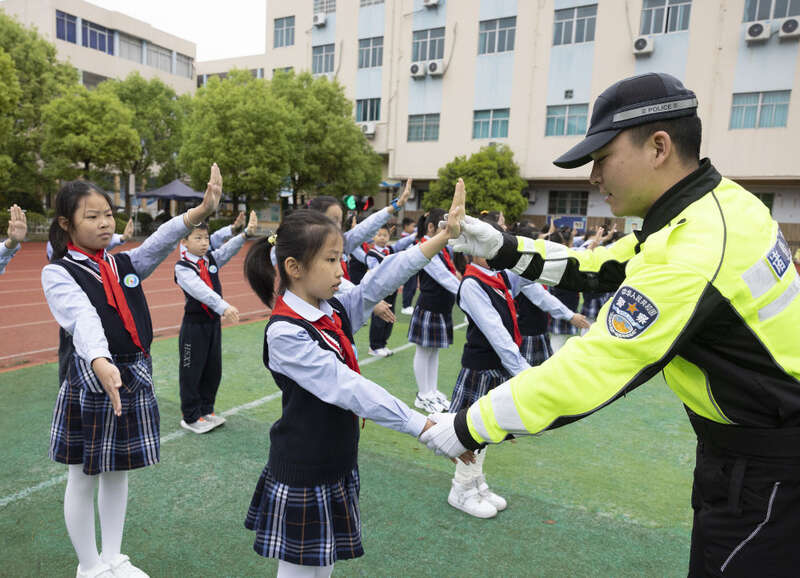4月14日,浙江省诸暨市公安局的民警在浣纱小学指导学生学习交通指挥手势。