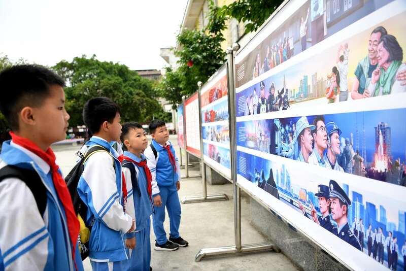 4月14日,贵州省榕江县车民小学学生在观看国家安全教育主题展板。