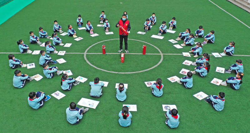4月14日,浙江省台州市仙居县第一小学的学生学习消防安全相关知识(无人机照片)。