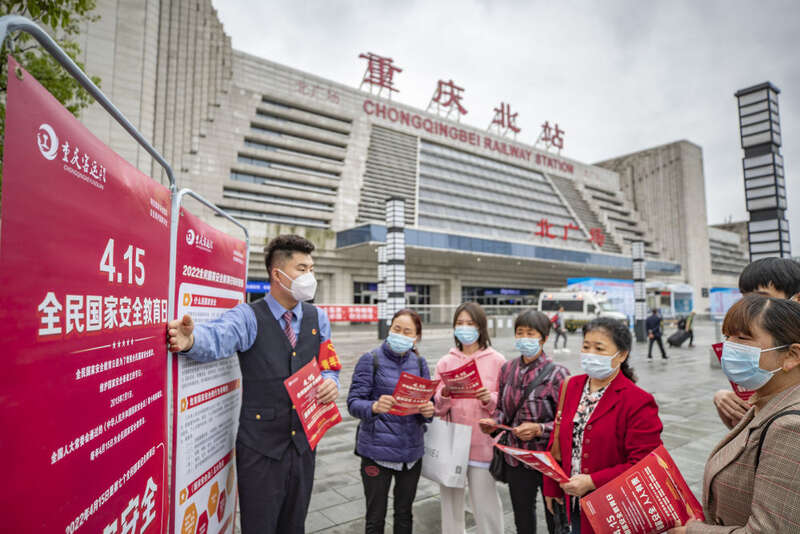 4月14日,在重庆北站北广场,中国铁路成都局集团有限公司重庆客运段青年职工志愿者为旅客宣讲防范化解危害国家安全行为的小知识。