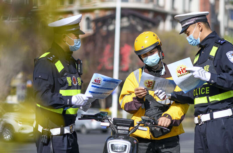 4月14日,在新疆乌鲁木齐市劳动街路口处,乌鲁木齐市公安局交通警察支队特勤大队民警向外卖骑手发放宣传手册。