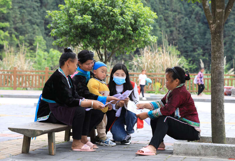 4月14日,志愿者在贵州省黔东南苗族侗族自治州从江县刚边乡三百河社区向人们讲解国家安全相关知识。