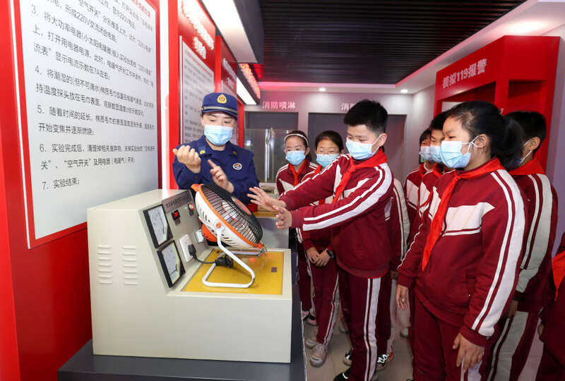 4月14日,在河北省石家庄市井陉矿区消防救援大队科普教育馆,消防队员(左一)为学生们讲大功率电器安全使用常识。