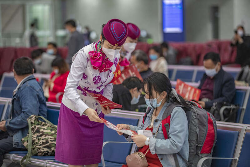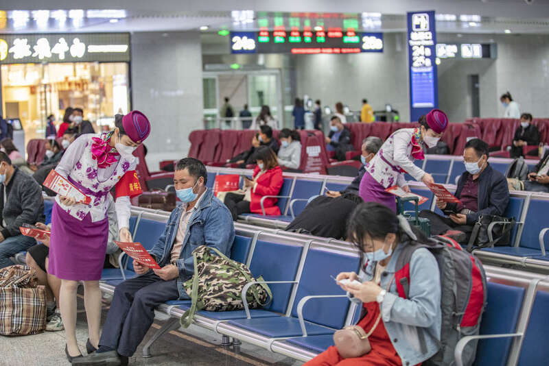 4月14日,在重庆北站候车大厅,中国铁路成都局集团有限公司重庆客运段青年职工志愿者为旅客发放国家安全日宣传单。
