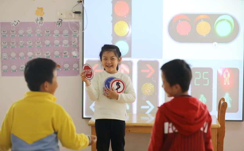 4月14日,在安徽省合肥市蜀山区琥珀街道北苑村社区辖区幼儿园,小朋友通过互动游戏的方式,学习了解交通安全知识。