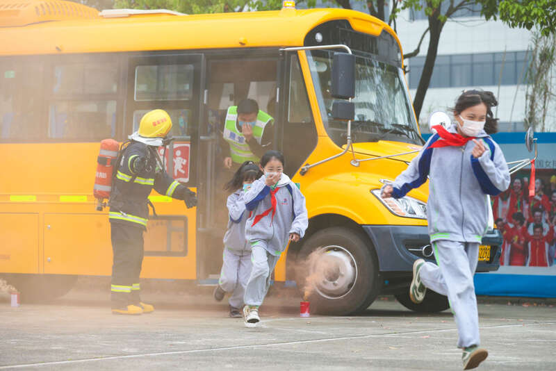 4月14日,在浙江省湖州市德清县雷甸镇中心小学通航校区,学生们在消防队员指导下进行校车应急逃生演练。