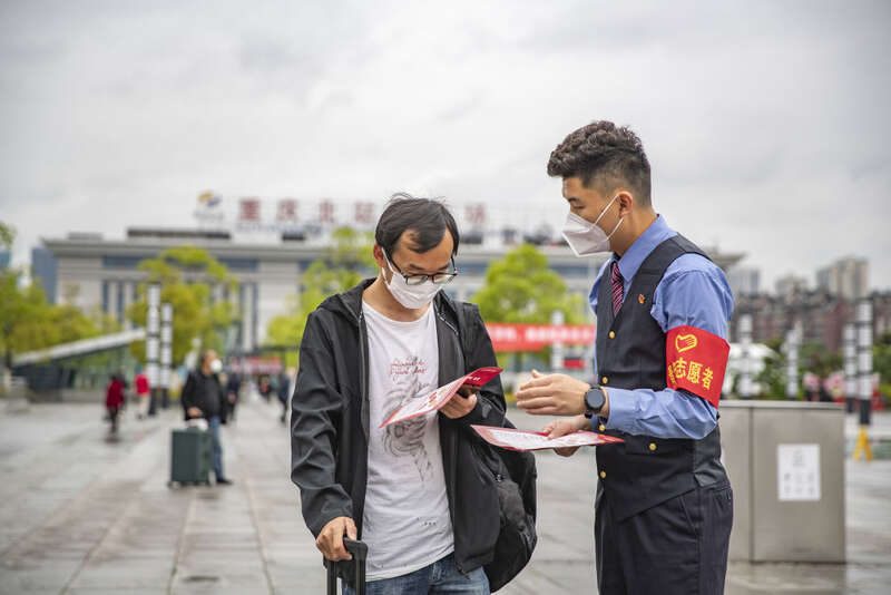 4月14日,在重庆北站北广场,中国铁路成都局集团有限公司重庆客运段青年职工志愿者向旅客发放国家安全日宣传单。