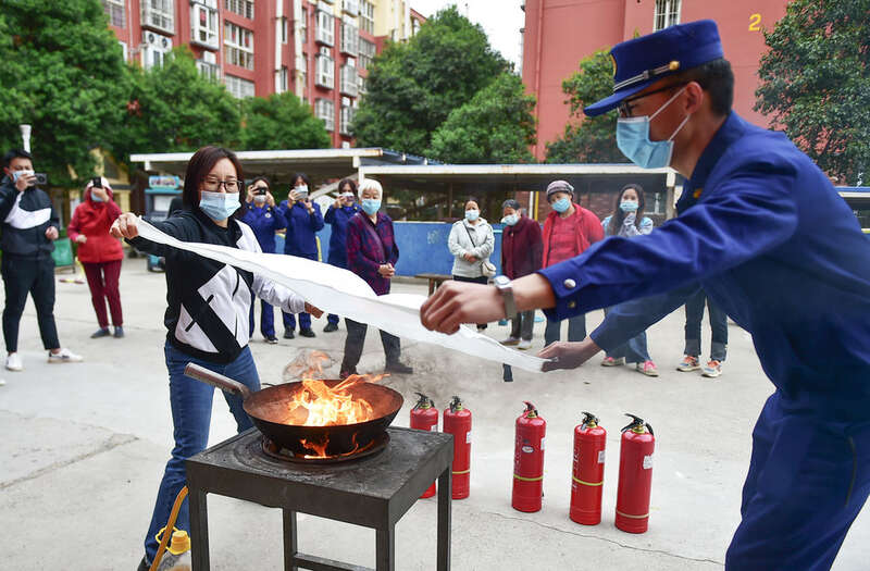 4月14日,在河南省洛阳市涧西区武汉路街道武汉路社区,居民在涧西区消防大队消防员的指导下练习使用灭火毯。