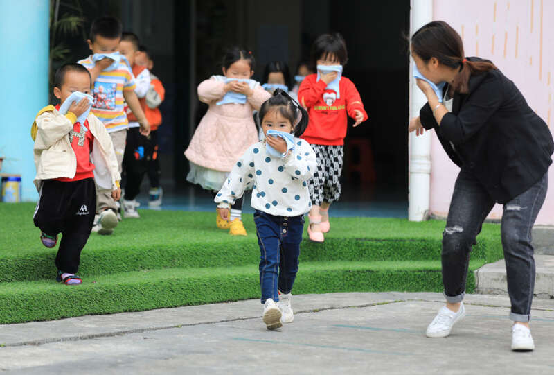4月14日,贵州省从江县刚边乡中心幼儿园的小朋友们在老师的组织下进行应急避险演练。