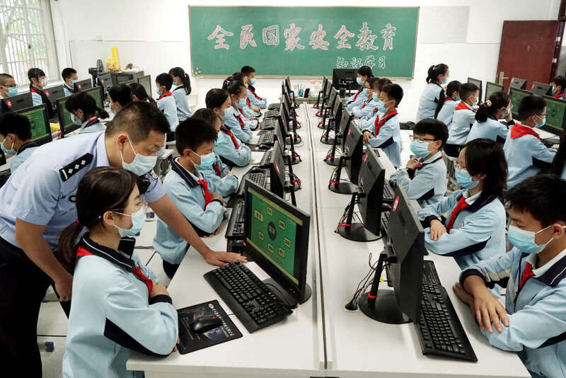 4月14日,公安民警在浙江省金华市武义县三角店小学多媒体机房指导学生进行国家安全教育答题。