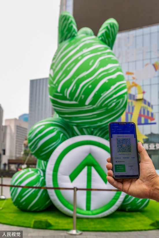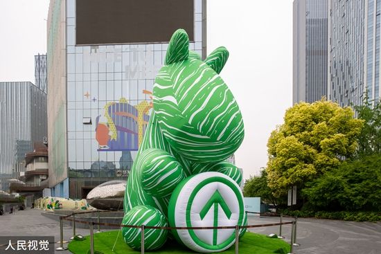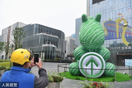 2022年4月14日,武汉,华发中城商都门口出现大型“绿马抱绿码”充气造型。