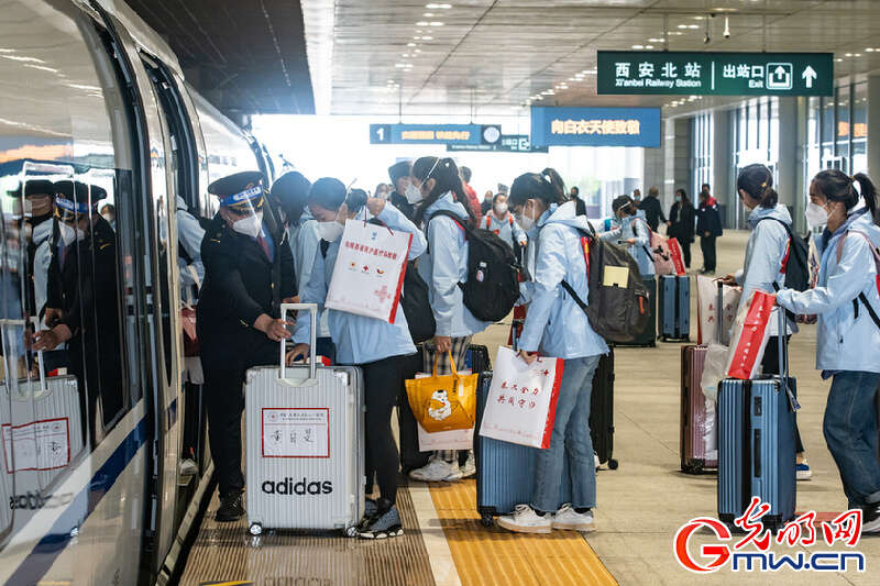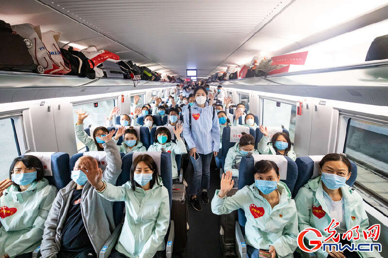 在接到医疗队出行需求后,中国铁路西安局集团有限公司特事特办、迅速行动,集结乘务组,准备长编组动车组2列,第一时间向国铁集团申请开行西安北至上海虹桥G1922次、G1926次高铁专列。(图片来源:光明图片 摄影师:刘翔)