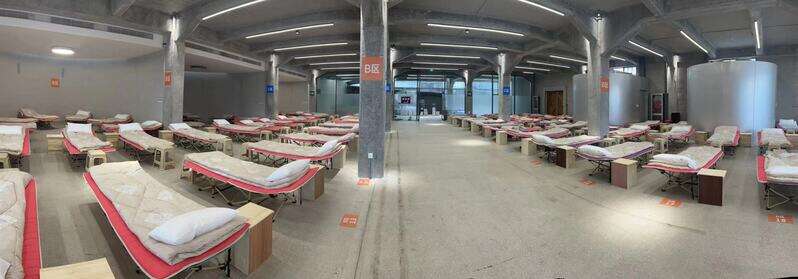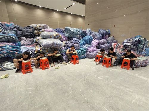 在方舱建设现场,团队在棉被存放区就地吃饭。