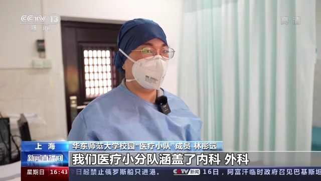 华东师范大学校园“医疗小队”成员 林彤远:我们医疗小分队涵盖了内科、外科、检验、药剂的临床一线的工作人员,主要是为学生线上问诊、电话的问诊,还有平时日常药物的分发,物资的发放,此外还参与每天的核酸采样工作。