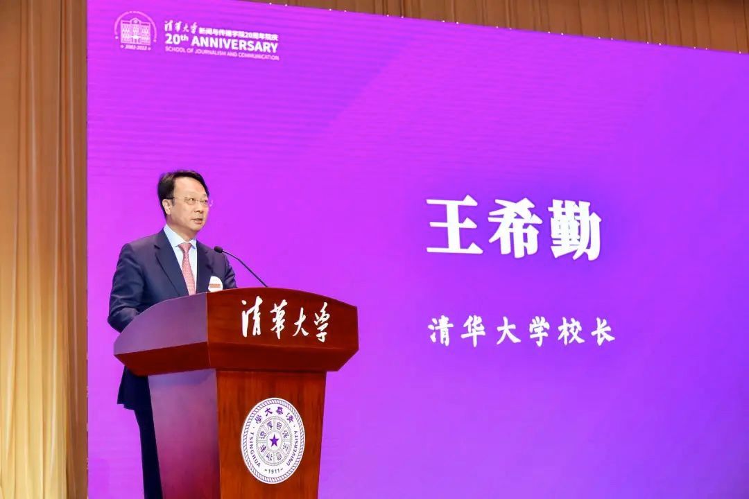 清华大学校长王希勤在致辞中回顾了清华大学设立新闻与传播学院的初衷。为了积极应对经济全球化和信息技术发展带来的机遇和挑战,为国家培养更多具有国际视野的高素质、复合型新闻传播人才,清华大学在原有传播系的基础上,成立了新闻与传播学院。他充分肯定了二十年来新闻与传播学院在人才培养、学科发展、国际交流合作等方面的成果,希望学院未来能够为向世界讲好中国故事、传播好中国声音提供更多人才储备和学理支撑,在构建中国特色新闻学的学术体系、学科体系、话语体系方面更加积极作为,持续探索中国特色清华风格的新闻传播教育,努力打造清华文科高原上的新高峰。