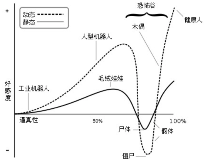一部分圈外人对BJD娃的“无法get”,其实是因为“恐怖谷”效应。随着物体的拟人程度增加,人类对它的好感度也会发生改变。当一些事物“接近人类”,但又和人类存在差异时,我们会认为它是某种怪胎或畸形,进而产生厌悉感,直到近似度超过了某个水平之后,它才会重新令人感到亲切。BJD玩家有时会要求精确到娃娃脸上要能画出毛孔、肌理和血管,这种介乎于似与不似之间的逼真性的要求,会让一些人感到怪异。