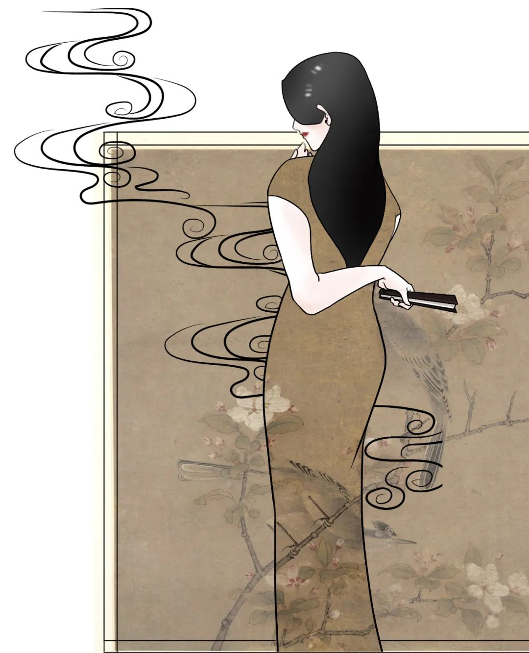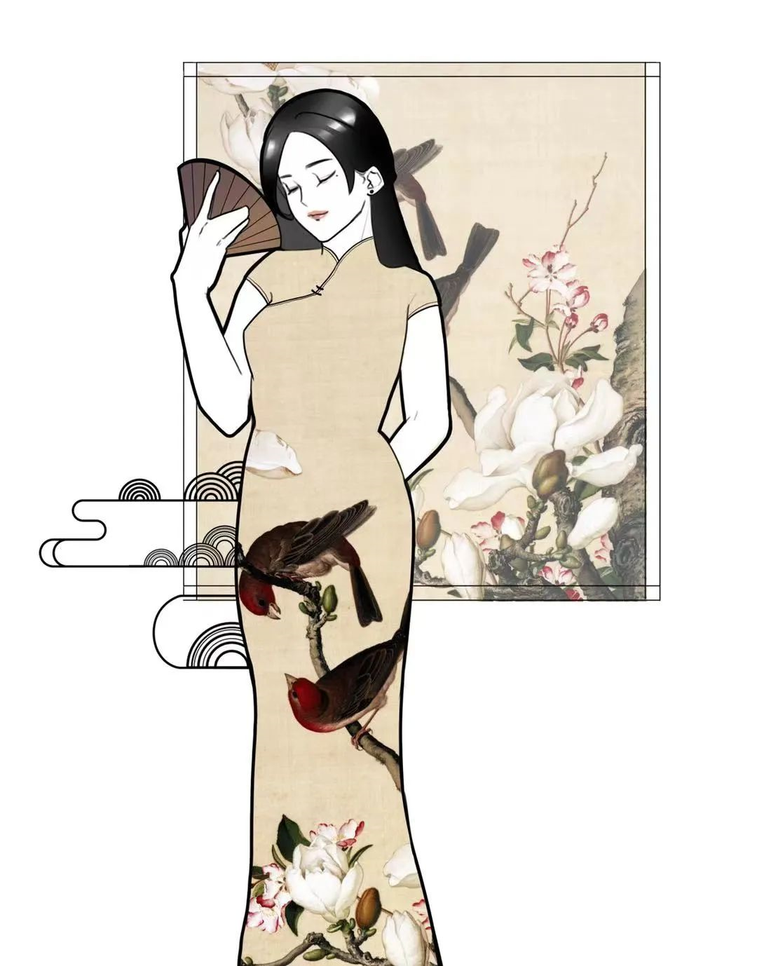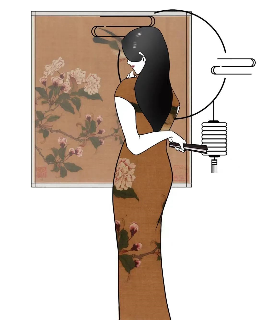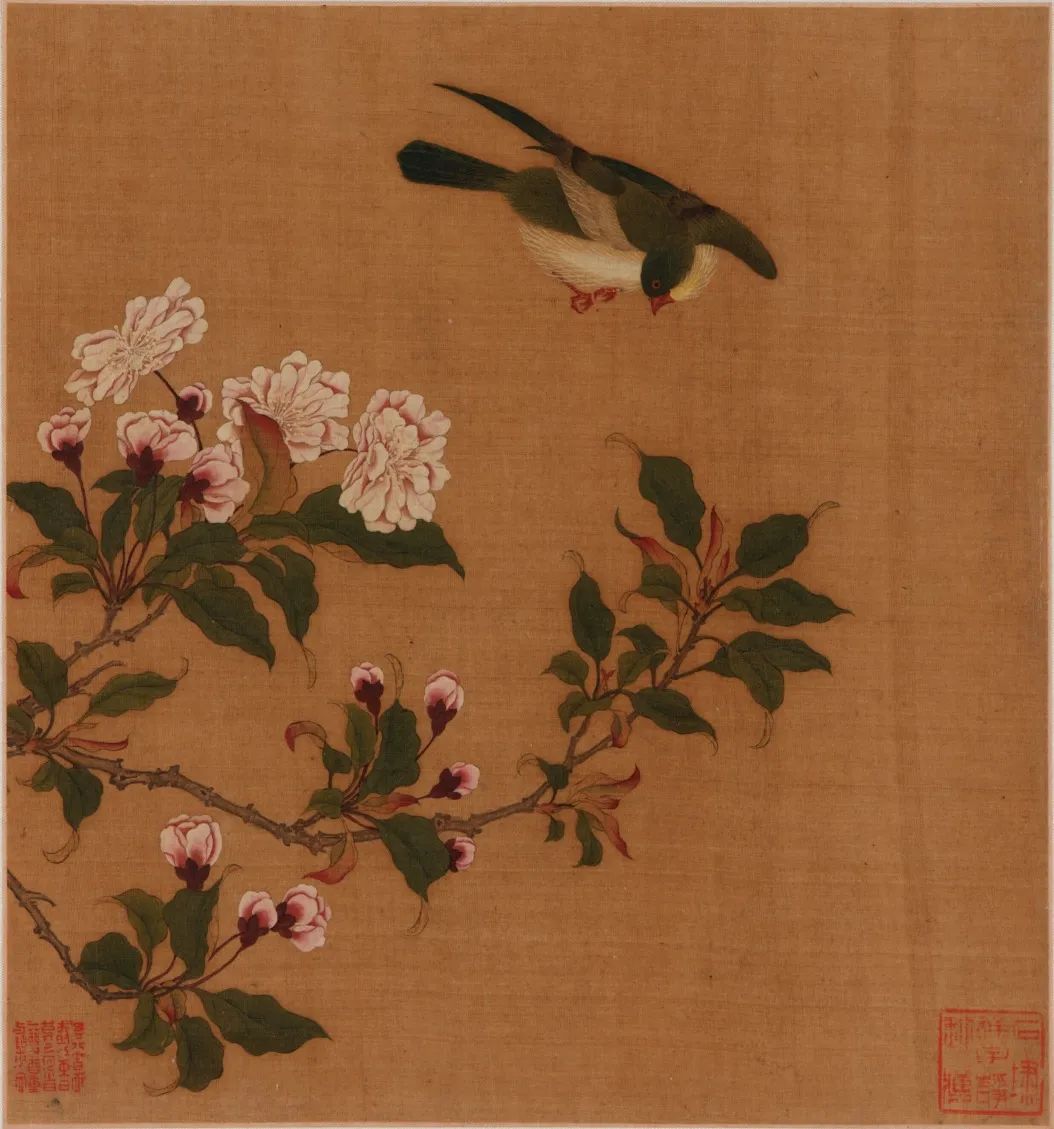 此幅画折枝海棠一支,一只鸟儿飞过,似被盛开的海棠花吸引,回首注视,画面中静态的花与动态的鸟遥相呼应,颇有意趣。