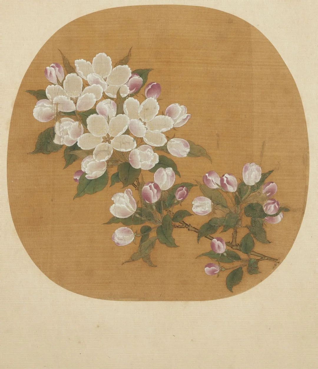 此幅绘折枝海棠一枝,或盛开、或含苞。花之设色,以白粉为底,罩以胭脂,娇柔可人。林椿,生卒年不详。浙江钱塘(今杭州)人。南宋孝宗淳熙年间(1174-1189),任画院待诏,工画花草、翎毛、瓜果,傅色轻淡,生意蔼然。