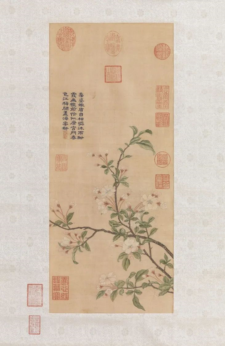 此幅缂丝有清高宗御制诗:柔姿嫰质自相怜,沐雨酣霞画槛前。恰似唐宫斗春色,江梅开尽海棠妍。