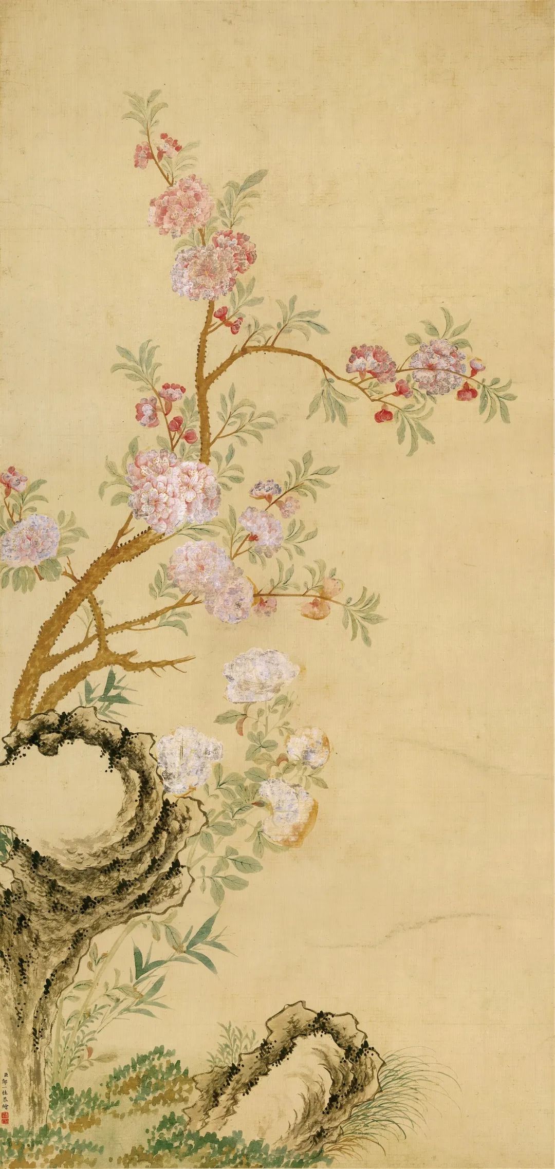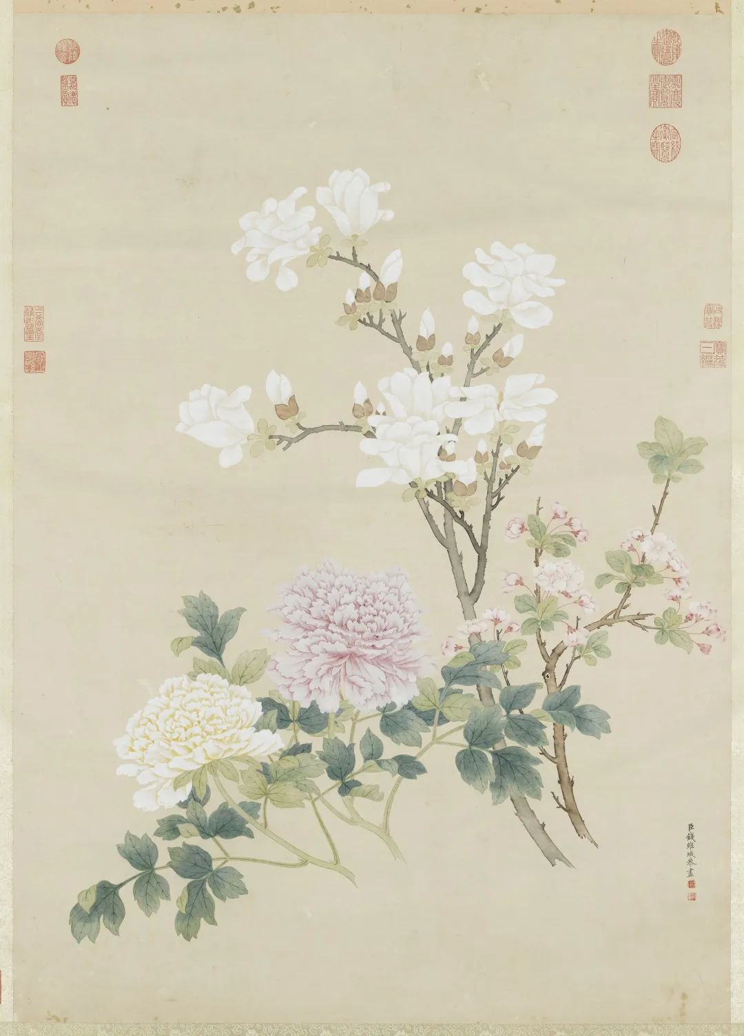 此画绘有玉兰花,牡丹,海棠,俱做无骨画法,设色典雅,折枝选取得当,布置悦目。