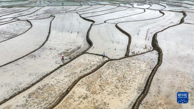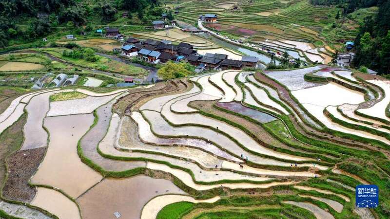 4月17日,村民在贵州省榕江县八开镇摆奶村乌娘溪梯田里劳作(无人机照片)。