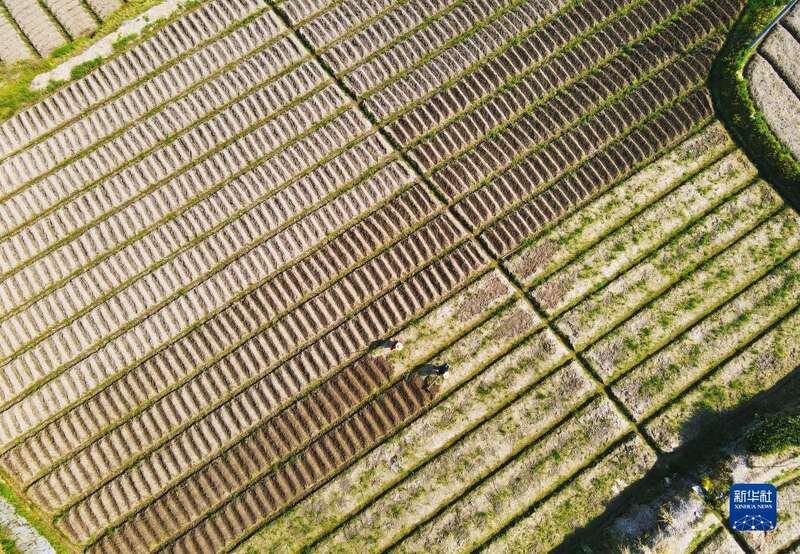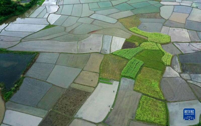 4月17日,湖南省常宁市庙前镇双凤村农民在整理农田(无人机照片)。