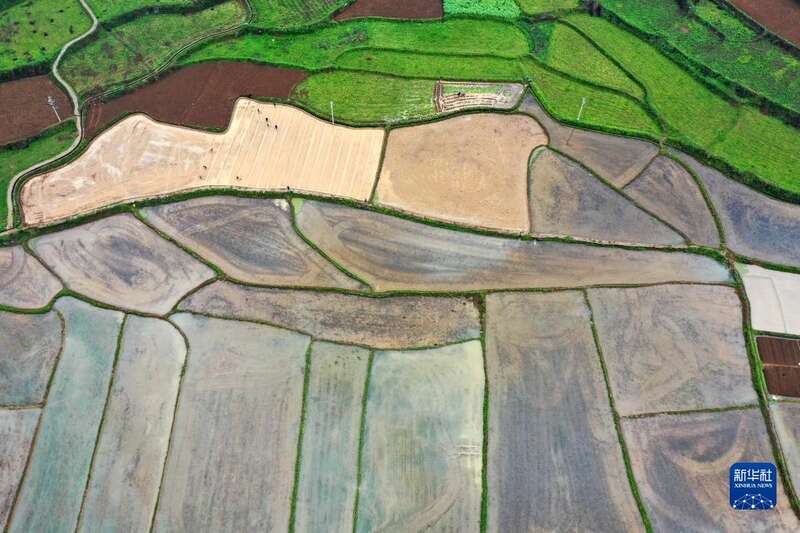 4月17日,村民在贵州省铜仁市玉屏侗族自治县朱家场镇前光村水田里劳作(无人机照片)。