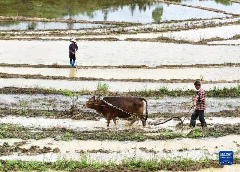 4月17日,湖南省郴州市嘉禾县晋屏镇宅侯村村民在梯田上犁田劳作。
