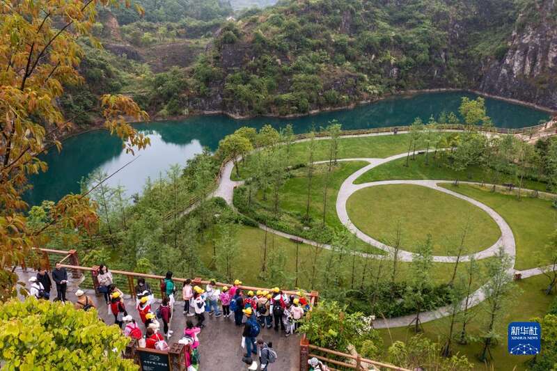 4月17日,参加活动的中小学生在地质专业工作人员的带领下,对铜锣山矿山公园的地质遗迹和生态修复进行科学考察(无人机照片)。