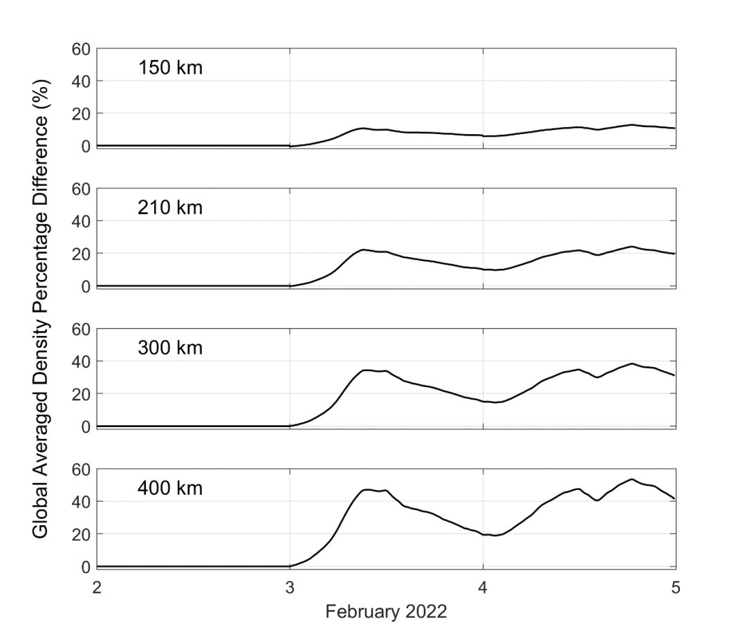我们模拟表明,2月3日磁暴发生后,4号又发生了连续的地磁扰动,导致热层大气密度持续处于高位。发射过程中,卫星进入210km高度后星载导航设备观测到大气密度在磁暴的影响下上升50%,为了抵御大气密度增大带来的拖曳力增大,卫星进入无动力的安全模式。由于密度持续保持高位,卫星无法切换至正常推进模式,导致发射失败。