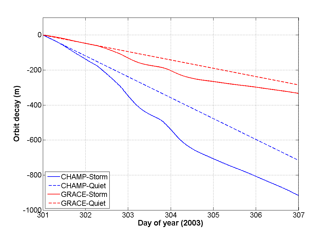太阳爆发/地磁暴期间,高层大气会被加热。高层大气密度会迅速上升,导致低轨道上航天器的阻力增加,从而改变航天器的正常运行轨道,增大航天器定轨和轨道预测的误差。