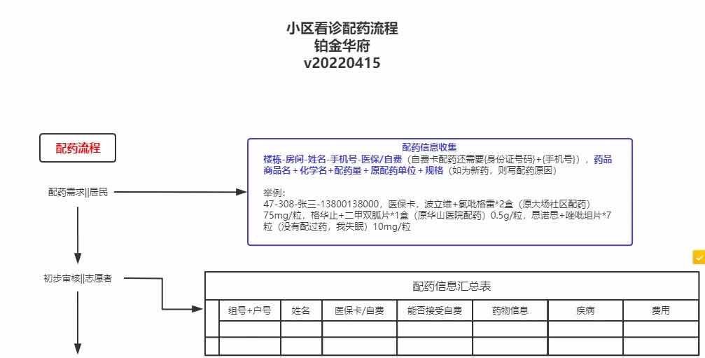 首先,楼栋志愿者开展配药信息收集。孙译维参与志愿服务的小区有70多个楼栋,近1600户居民,“配药信息里必须写明:楼栋、房间、姓名、手机号、医保/自费、药品化学名、商品名、配药量、原配药单位、疾病等,提前一天收集汇总到居委会。” 对配药信息收集,孙译维提出了标准化要求。