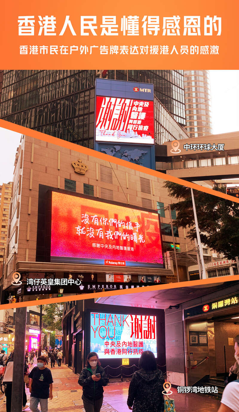 很快,在香港中环、湾仔、铜锣湾等最繁华的街头,都出现了巨幅广告牌,上面写着:“没有你们的援手就没有香港的曙光”“谢谢中央及内地医护与香港同行抗疫”“香港上下一心齐抗疫”等。