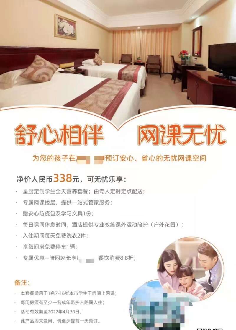 ——“网课房”是否合规。广州推出“网课房”的酒店大多在宣传广告中标明了“每间房须至少有1名成年监护人陪同入住”,还有部分酒店推出的“网课房”则未说明需成年人陪同。此外,大多数“网课房”宣传适用于“7-16岁学生”,有的酒店宣传单上显示招收学生低至3岁。