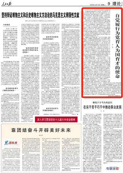 4月19日,《人民日报》刊发了清华大学党委书记邱勇的文章《自觉履行为党育人为国育才的使命》。邱勇指出,高校肩负着为党育人、为国育才的光荣使命,必须坚定人才培养自信,不断提高人才培养质量,为国家、为民族、为人民培养更多可堪大任的杰出英才。
