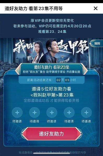 最近正在追电视剧《我叫赵甲第》的网友发现,即便已经是VIP会员,要想继续追下去,还需要再邀请5位好友助力,才能解锁最新两集的内容,并且每位受邀者在活动期间还只能助力一次。有网友表示,确定不是拼多多?