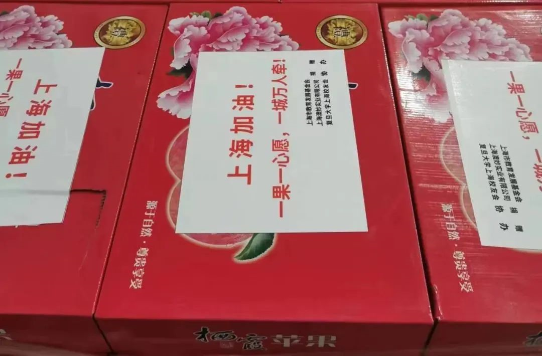 促成此次捐赠的上海校友会副会长华彪特别邀请复旦校友、诗人傅亮题句。傅亮感此义举,深情写下“上海加油!一果一心愿,一城万人牵”,此题句印在装载着爱心苹果的箱子上,更印在大家心里。