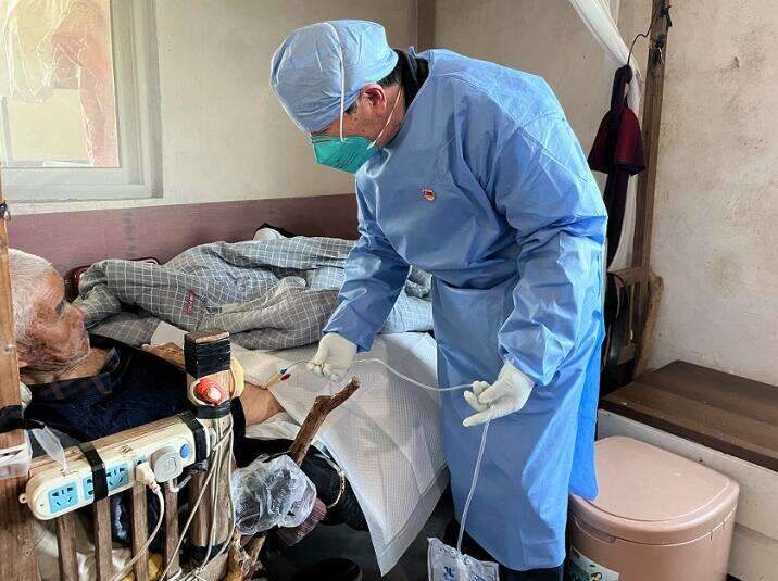 家庭医生上门为80岁的王老伯更换导尿管