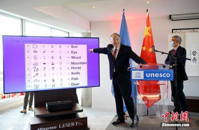 中国常驻联合国教科文组织代表杨进(左)现场致辞,向来宾介绍中文。 中新社记者 李洋 摄