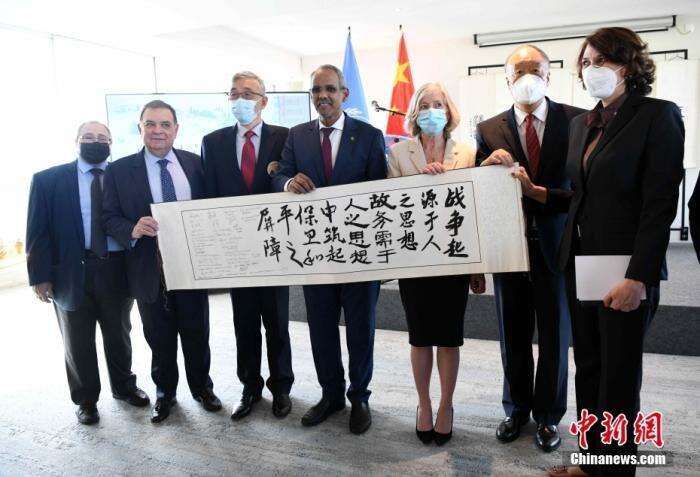 多国常驻教科文组织外交官共同书写了中文长卷“战争起源于人之思想,故务需于人之思想中筑起保卫和平之屏障”,表达对和平的祈愿和坚守。 中新社记者 李洋 摄