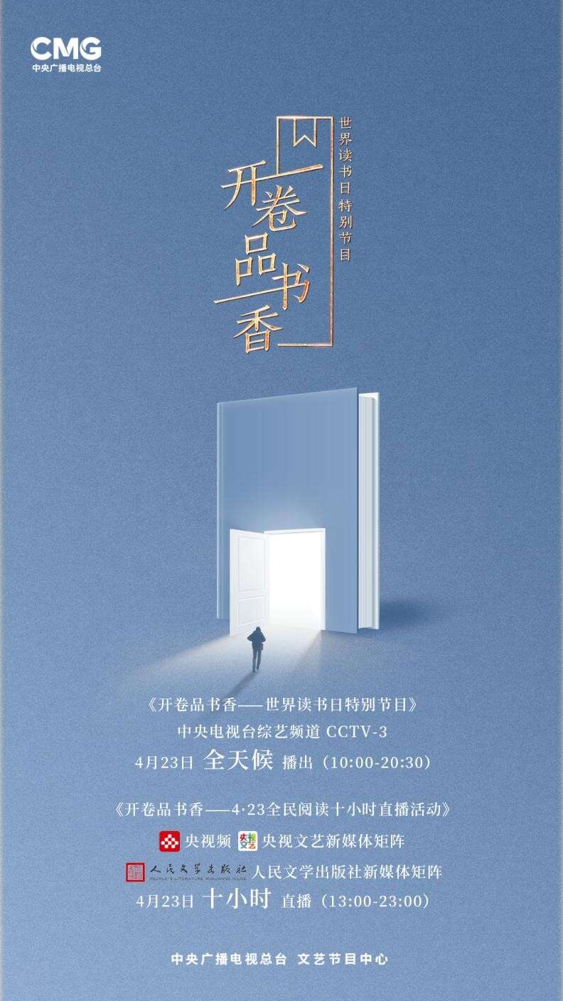 当日13点至23点,文艺节目中心联合人民文学出版社举办“4·23全民阅读十小时直播活动”,将在央视频、央视文艺新媒体矩阵、人民文学出版社新媒体矩阵上线。