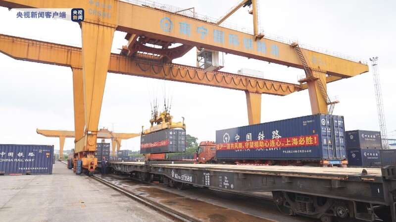 4月22日下午,一列满载194吨生活物资的援沪专列从南宁国际铁路港发出,开往上海市杨浦站。这是广西发出的第二趟援沪生活物资直达专列。