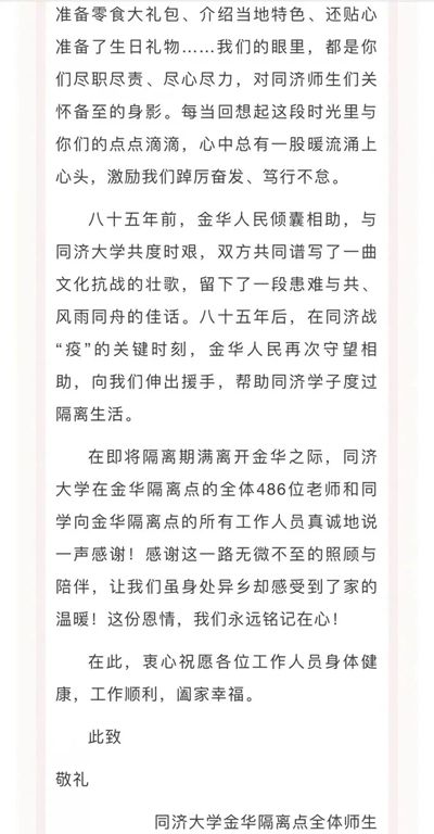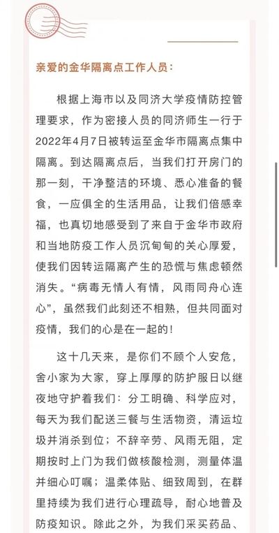 4月7日起,同济大学在上海市教委和所属区政府的安排下,先后多批将校内密接人员转运至市外或市内隔离点,进行医学隔离观察。第一批同济学子转运至浙江省金华市的隔离点。