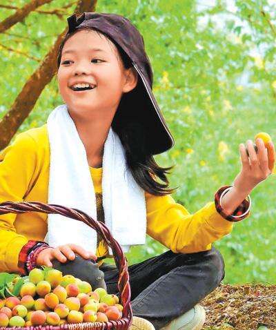 广东省汕尾市陆河县水唇镇,一名小游客体验采摘青梅。苏维平摄(人民视觉)