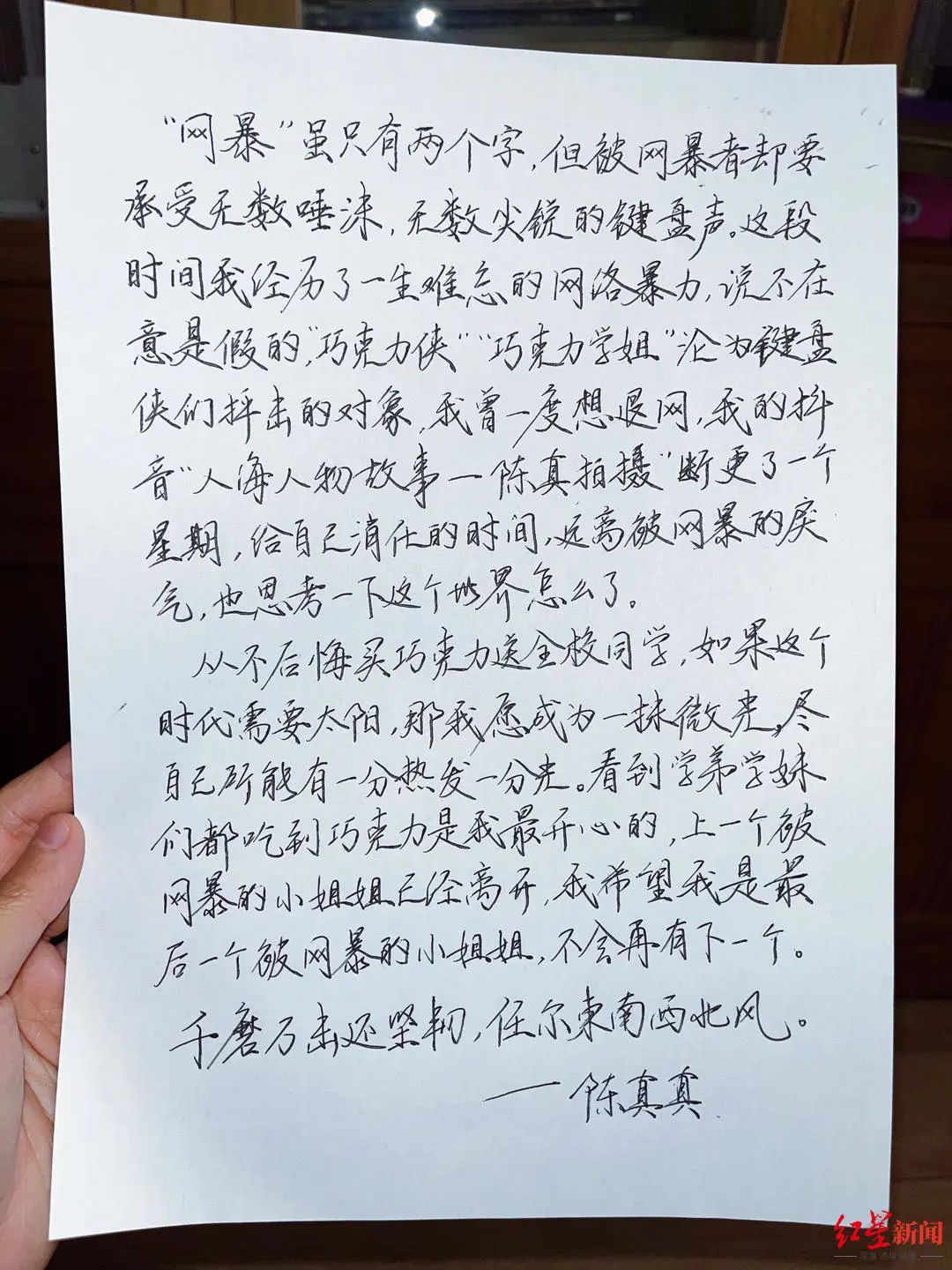 让人意想不到的是,就是这样一则本该让人会心一笑的校园“暖闻”,竟然在登上网络热搜之后,被某些网民恶意揣度引导,引发了一场规模不小的网暴。一时间,“舞女的世界我不懂”“你不就是想火吗”“你哪来的钱”“你为什么不去做志愿者”“为什么要买国外的巧克力牌子”……形形色色的质疑与谩骂开始充斥当事人的各个社交帐号。网络暴力来势汹汹,陈真真只要点开社交平台,几乎都是“99+”的未读消息提示。受此影响,陈真真一度想要“退网”,但她最终想通了:既然错的不是自己,凭什么要对网暴分子退让?