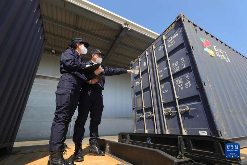 4月22日,沈阳海关关员在列车出发前核对集装箱箱号。