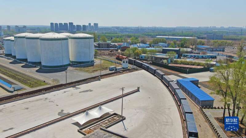 4月22日,辽宁首趟中老铁路国际货运列车驶出站台(无人机照片)。