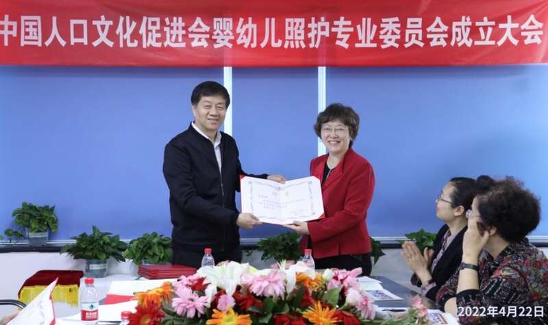 图为中国人口文化促进会秘书长宋建平宣布中国人口文化促进会婴幼儿照护专业委员会成立,并为在场的专业委员会成员颁发聘书