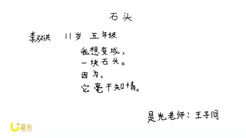 康瑜:什么时候教孩子写诗?2016年的十月,一个雨天,刚好我在教课,孩子们总朝窗外看。我说,那我们就写一些东西吧。但孩子们不愿意写长的文章。我说,那就写短的吧,我们来写诗歌。选择诗歌这一文体进行文学教育,主要还是诗歌这一形式更贴近他们,也比较好写。对孩子们来说不太难。